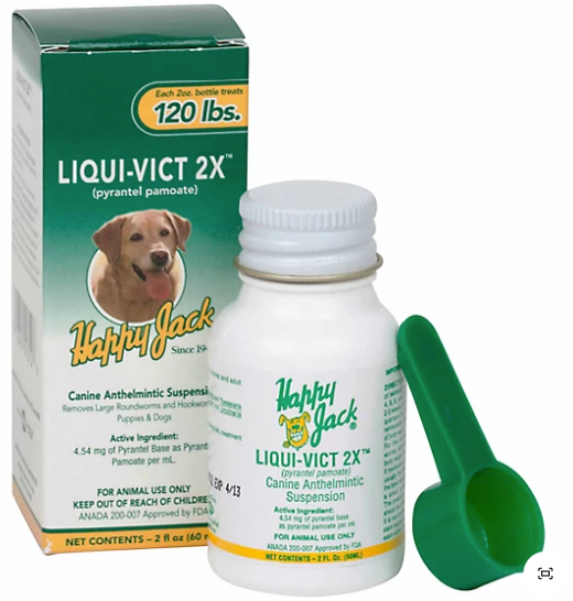Liqui-Vict 2X is another convenient wormer from Happy Jack for the removal of roundworms (Toxocara canis & Toxascaris leonina) and hookworms (Ancylostoma caninum & Uncinaria stenocephala). Simply measure appropriate amount of Liqui-Vict 2X with enclosed measuring spoon and mix with food. That’s it. We recommend it as part of your monthly preventative health care plan to eliminate internal parasites. Each 2 oz. bottle worms 120 lbs. of body weight.